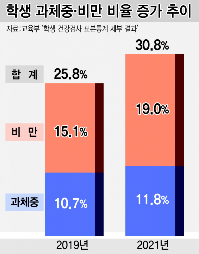 학생들의 성장 수준 상태를 보면 코로나 여파가 곳곳에서 드러난다. 교육부의 2021 학생 건강검사 표본통계 세부 결과에서 가장 큰 변화가 나타난 지표는 비만, 과체중 학생 비율이다.