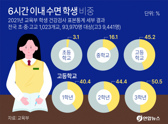 조사 결과에 따르면 우리나라 고등학교 3학년 학생 2명 중 1명은 하루 6시간도 자지 못하는 것으로 나타났다. 고3 학생 50.5%는 하루에 6시간도 자지 못한다고 응답했다. 학교 급별로 보면 초등학교 때는 10% 미만인 6시간 미만 수면 부족 응답 비율은 중학교 1학년에서 9.5%로 확대된 뒤 2학년이 되면 16.1%로 두 자릿수를 기록하고 3학년이 되면 22.9%로 뛰었다. 교육부가 학생 건강검사를 시행한 2009년 이후 13년간 6시간 이내 수면율은 초등학교의 경우 한 자릿수, 중학교는 10% 안팎을 기록하다가 고등학교가 되면 40%대까지 치솟는 양상이 반복되고 있다.