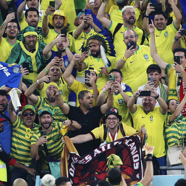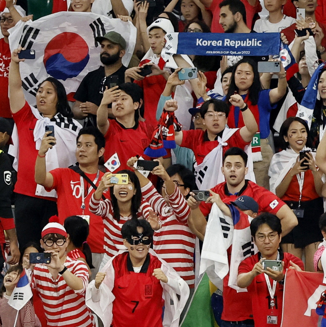 2022 카타르 월드컵 16강전 한국과 브라질의 경기가 6일(한국시간) 오전 4시 카타르 도하의 스타디움 974에서 열렸다. 지난 3일 열린 포르투갈과의 조별 예선 최종전에서 응원을 펼치는 대한민국 붉은악마(위쪽) 응원단과 지난달 28일 스위스전에서의 브라질 응원단. 로이터연합뉴스
