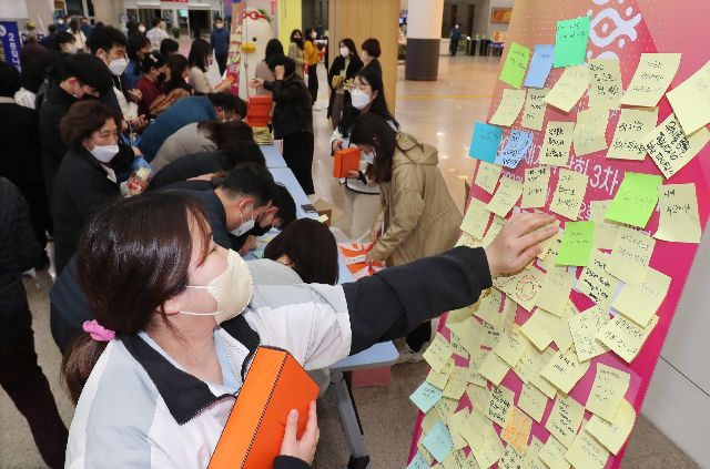 29일 오후 부산시청 1층 들락날락에 설치된 초대형 스크린 앞에서 2030세계박람회 유치를 위한 3차 경쟁 프리젠테이션 생중계를 앞두고 시민들이 세계박람회 유치를 기원하는 포스트잇을 붙이고 있다. 강선배 기자 ksun@ 2022.12.01 부산일보DB