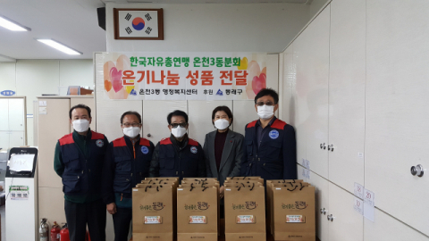 한국자유총연맹 온천3동분회(회장 이정재)는 지난 1일 온천3동 행정복지센터에서 홀몸 어르신 및 어려운 이웃을 위한 성품 전달식을 가졌다. 한국자총 온천3동분회는 32세대에 내복 2벌씩을 전달했다.