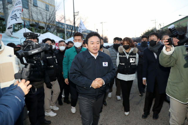 원희룡 국토교통부 장관이 6일 경북 포항시 남구 오천읍 포항철강산업단지 내 민주노총 공공운수노조 화물연대본부(화물연대) 포항지역본부의 총파업(운송거부) 천막 농성장에서 화물연대 지도부와 만나 이야기를 한 뒤 나오고 있다. 연합뉴스