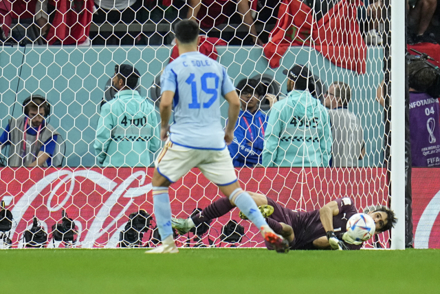 모로코의 골키퍼 야신 부누가 7일 스페인과의 16강전 승부차기에서 카를로스 솔레르의 슛을 막아내고 있다. AP연합뉴스연합뉴스