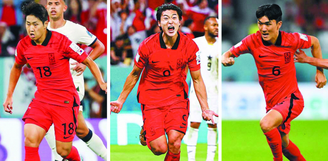 2022 카타르 월드컵에서 16강에 진출한 한국 축구 대표팀은 차세대 주역들의 가능성도 확인했다. 왼쪽부터 이강인, 조규성, 황인범. 로이터AFP연합뉴스