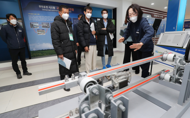 7일 부산 기장군 교통공사 안평차량사업소 경전철 홍보관에서 부산을 방문한 캄보디아 프놈펜시 교통 정책 공무원들이 경전철 운용체계에 대한 설명을 듣고 있다. 강선배 기자 ksun@