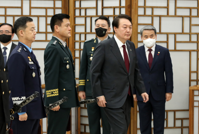 7일 서울 대통령실 청사에서 열린 장성 보직신고 및 삼정검 수치 수여식에 참석하는 윤 대통령. 연합뉴스