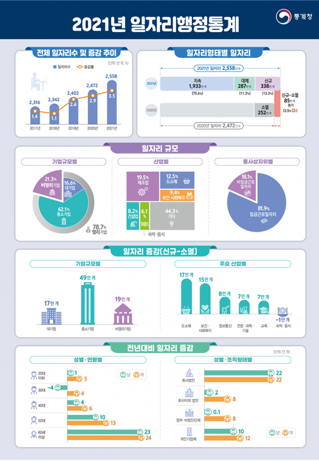 8일 통계청이 발표한 '2021년 일자리행정통계'(사진)에 따르면 2021년 일자리는 2558만 개로 전년대비 85만 개(3.5%) 증가한 것으로 집계됐다. 전년과 동일한 근로자가 점유한 지속일자리는 1933만 개(75.6%), 퇴직‧이직 등으로 근로자가 대체된 일자리는 287만 개(11.2%)였다. 기업 생성, 사업 확장으로 생긴 신규일자리는 338만 개(13.2%), 기업 소멸, 사업 축소로 사라진 소멸일자리는 252만 개로 나타났다.