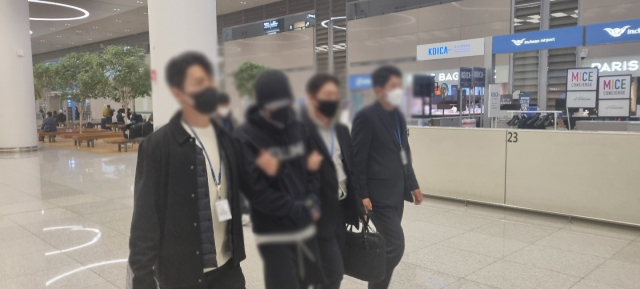 호주 인터폴과 국제공조를 통해 검거된 30대 A 씨가 7일 인천공항에서 김해중부경찰서로 압송되고 있다. 경남경찰청 제공