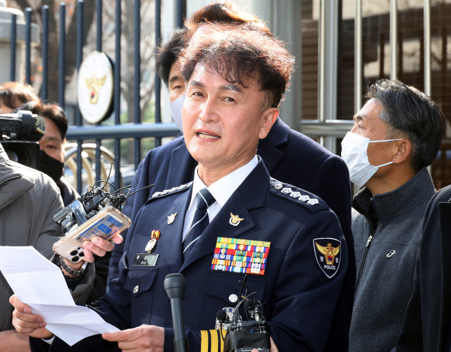 류삼영 총경이 8일 중앙징계위원회가 열리는 서대문구 경찰청 앞에서 기자회견을 하고 있다. 류 총경은 경찰국 신설 여론 수렴을 위한 전국 경찰서장 회의를 추진했다. 연합뉴스