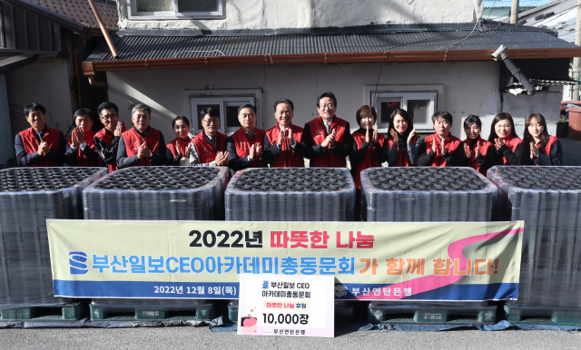 부산일보CEO아카데미 총동문회는 8일 부산 동구 매축지마을과 동구청 광장에서 ‘사랑의 연탄 나눔’과 ‘사랑의 김장나누기’ 전달식을 개최했다.