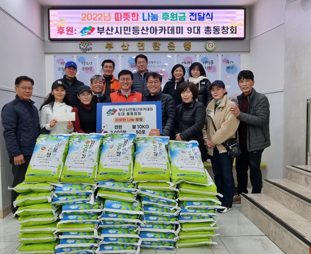 부산시민등산아카데미 총동창회(회장 김용진)는 10일 부산연탄은행과 협약을 맺고 동구에 연탄 500장을 배달하고 연탄은행에 쌀 10Kg 50포대를 기증했다.