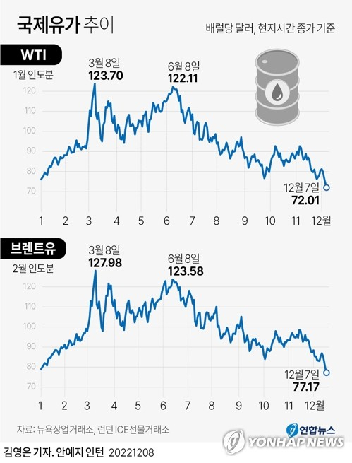 12월 첫째 주(4∼8일) 휘발유 가격은 전국평균 L당 1611.1원으로 전주보다 15.1원 내리는 등 주간 단위로 13주째 하락세를 이어가고 있다. 국내 유류 가격의 선행지표인 국제유가 역시 경기 침체 우려의 영향으로 내려가는 추세다.