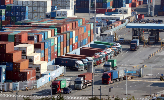 화물연대 파업 종료 후 첫 주말인 11일 오후 부산 남구 신선대부두 앞에서 트레일러들이 분주하게 오가고 있다. 정종회 기자 jjh@