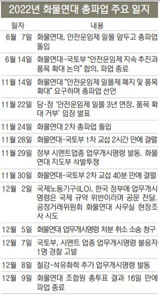 민주노총 공공운수노동조합 화물연대본부(화물연대)가 조합원 찬반 투표를 거쳐 장장 16일간 이어오던 총파업을 큰 성과 없이 마무리했다. 대화의 창구를 닫은 정부가 연일 ‘강경 대응’으로 나서자 조합원들은 투쟁을 지속하기에 어려움을 느꼈다. 정부가 이번 파업을 ‘법과 원칙’에 따른 승리라고 보는 가운데, 노동계는 향후 정부의 노동 탄압 기조가 이어질 것을 우려했다.