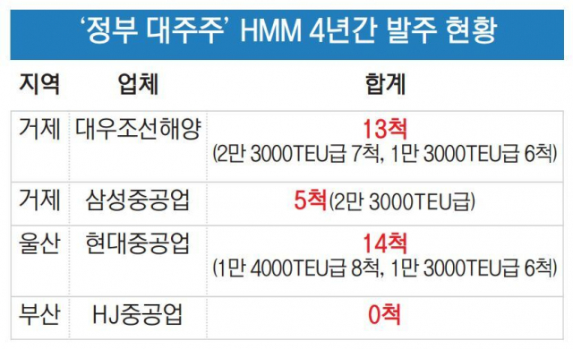 지난해 해양수산부는 10년 안에 원양 컨테이너 선복량을 150만TEU 이상 끌어 올린다는 해양재건 가속화 계획을 세웠다. HMM을 중심으로 국내 조선사에 대형 선박 발주를 몰아준 것도 이 때문이다. HMM은 산업은행과 한국해양진흥공사 등 정부 기관이 대주주로 참여하고 있다.