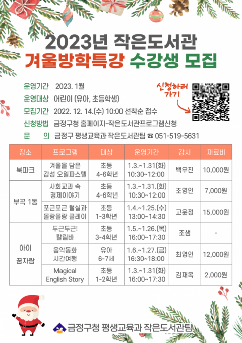 부산 금정구(구청장 김재윤)는 ‘2023년 금정구 작은도서관 겨울방학특강’ 수강생을 오는 14일 오전 10시부터 금정 공공예약 서비스(www.geumjeong.go.kr/booking/index.geumj)를 통해 선착순으로 모집한다고 밝혔다.