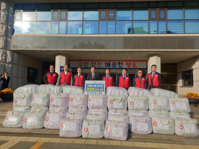 영도라이온스클럽(회장 김의욱)은 최근 영도구청을 방문해 이웃돕기성품(겨울이불 80채, 320만 원 상당)을 기탁하는 전달식을 가졌다.