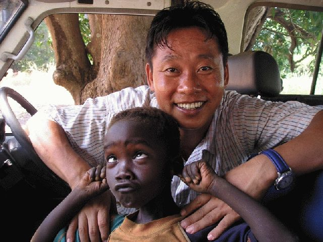 2004년 수단에서 즐거운 표정으로 한 아이와 장난을 치고 있는 이태석 신부. 부산일보DB