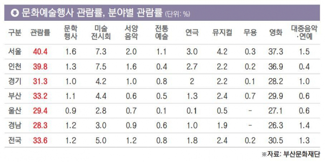 소비(향유) 측면에서도 차이가 났다. 2021년 ‘국민문화예술활동조사’ 결과에 따르면 부울경 지역 문화예술행사 관람률은 전국 평균(33.6%)보다 낮았다. 문화예술행사 관람 시 걸림돌을 물었더니 수도권에선 ‘시간 부족’을, 부울경 지역은 ‘관심 프로그램 없음’과 ‘비용이 많이 든다’로 나타났다.