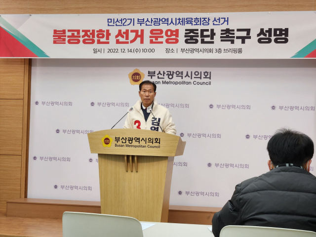 부산시체육회장 후보로 나선 김영철 전 부산시테니스협회 회장은 14일 부산시의회에서 ‘시체육회는 불공정한 선거 운영을 중단하라’는 성명을 발표했다. 이 자리에서 김 후보는 시체육회 선거운영위원회가 자의적 유권해석으로 시민을 기만하고 있다고 주장했다.