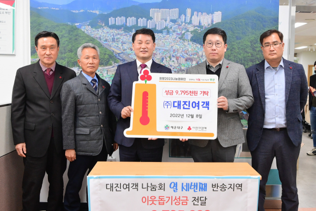 (주)대진여객(대표이사 조현욱)은 최근 김성수 해운대구청장, 반송1・2동장이 참석한 가운데 부산 해운대구 반송2동 행정복지센터에 성금 979만 5000원을 전달했다.