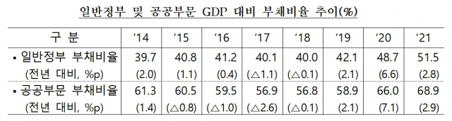 기획재정부는 15일 이런 내용의 '2021회계연도 일반정부 및 공공부문 부채 집계 결과'(사진)를 발표했다.