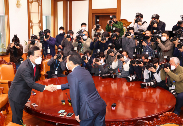 예산안을 두고 ‘강 대 강’ 대치를 이어가던 더불어민주당이 15일 예산안 협상의 최대 쟁점인 법인세 최고 세율을 1%포인트 내리는 등 김진표 국회의장의 중재안을 받아들이기로 했다. 민주당 박홍근(오른쪽) 원내대표와 국민의힘 주호영 원내대표가 15일 국회 의장실에서 열린 국회의장 여야 원내대표 회동에 앞서 인사하고 있다. 김종호 기자 kimjh@