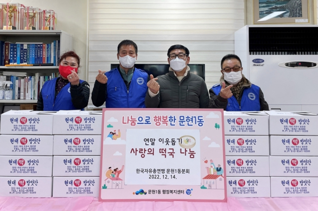 한국자유총연맹 문현1동분회(회장 이갑두)는 지난 14일 부산 남구 문현1동행정복지센터에 이웃돕기 떡국 떡 20상자를 기탁했다.