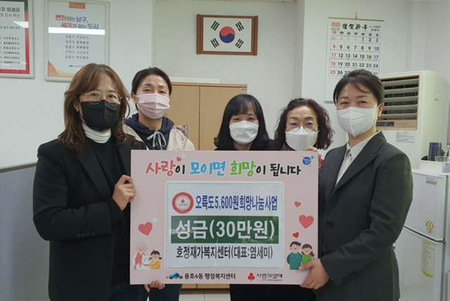 호정재가복지센터(대표 염세미)는 성금 30만 원을, 이정형외과(대표 이창원)는 성금 50만 원을, 숙이네(대표 이미숙)는 성금 10만 원을 오륙도 5600원 희망나눔사업에 사용해 달라며 용호4동 행정복지센터에 기탁했다.