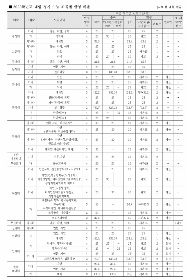 부산지역 대학 중 부산대, 부경대, 한국해양대, 동명대를 제외한 나머지 대학은 수능 영역별 반영 비율이 국어, 수학, 영어, 탐구 영역이 모두 25%로 동일하다. 대부분 탐구 2과목을 반영하지만, 고신대(의예과 제외), 동명대, 동서대, 신라대, 영산대는 탐구 1과목만 반영한다. 부산외대는 제2외국어/한문 과목을 탐구 1과목으로 대체 가능하다. 부산대는 인문 사회 계열은 국어 영역의 반영 비율이 상대적으로 높고, 자연이공계열은 수학 영역과 과학탐구 영역의 반영 비율이 상대적으로 높다. 또, 부경대, 한국해양대는 계열별로 국어 영역 또는 수학 영역의 반영 비율이 상대적으로 높다. 탐구 한 개 과목을 반영하는 대학의 경우 대부분 (상위 1과목의 점수×2)로 점수를 산출하지만, 동명대의 경우에는 상위 한 개 과목의 점수만 그대로 반영하기 때문에 국어, 수학, 영어 영역에 비해 탐구 영역의 반영 비율이 낮다.