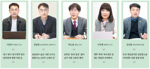부산시교육청 진학지원단 소속 진학 상담 전문 교사들과 올해 대입 경향과 전략을 짚어봤다. 왼쪽 아래부터 부산시교육청 진로진학센터 강성원 팀장, 진로진학센터 강동완 교육연구사, 주례여고 이영식 교사, 배정고 박두일 교사, 동래여고 이주현 교사(시계방향). 정대현 기자 jhyun@
