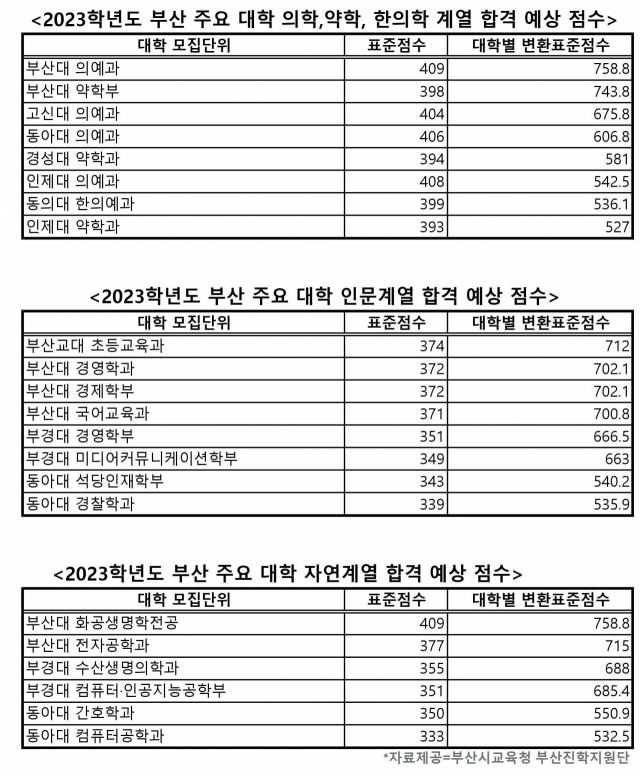 부산시교육청 소속 부산학력개발원 부산진학지원단이 공개한 ‘2023 대입 부산지역 수능 실채점 분석 및 정시 상담참고표’에 따르면 의·치·약·한의계열에서는 부산대 의예과 409점(변환표준점수 758.8점), 인제대 의예과 408점(542.5점), 동의대 한의예과(인문) 395점(538.5점), 경성대 약학과 394점(581점)으로 추정됐다. 부산진학지원단은 부산 지역 99개교, 2만 1486명의 수능 응시자를 대상으로 합격 예상 점수를 추정했다.