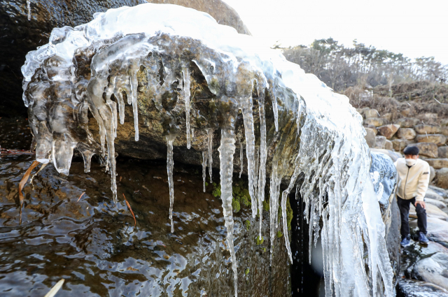 부산지역 최저기온이 영하 4.4도를 기록한 지난 15일 부산 화명수목원 계곡에 커다란 고드름이 얼어붙어 있다. 부산일보DB