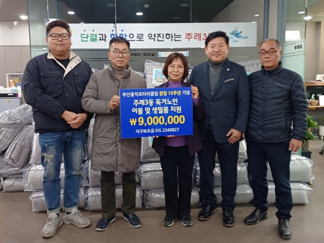 홍익로타리클럽 국제로타리 3661지구(회장 박해욱)는 최근 연말을 맞아 부산 사상구 주례3동 행정복지센터(동장 구미정)에 900만 원 상당의 겨울이불과 식료품세트를 기탁했다.