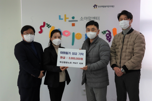 부산항운노조 PNIT지부(지부장 김형진) 공조회는 연말을 맞아 21일 한국백혈병어린이재단 부산나음 소아암센터에 소아암 어린이 환자를 위해 200만원을 기부했다.