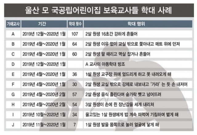 그는 12월에도 자신의 근처를 지나는 3살 원생을 끌어당겨 양손을 잡아 원생의 얼굴 앞에서 2차례 손바닥을 부딪치게 하는 등 신체적·정서적 학대를 멈추지 않았다. A 씨는 그 무렵부터 2020년 1월까지 원생 10여 명에게 107차례 학대한 혐의를 받고 있다.