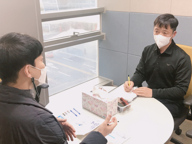 부산스마트쉼센터 김환구 상담사가 스마트폰 과의존 잠재적 위험군으로 분류된 기자의 스마트폰 사용 시간과 패턴을 듣고 있다.