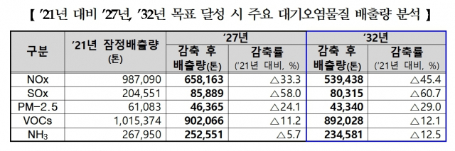 목표를 달성할 경우 대기오염물질 배출량이 작년 대비 2027년에는 6~58%, 2032년에는 12~61% 감소할 것으로 환경부는 전망했다.