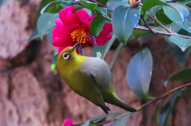 27일 부산 해운대구 동백섬에서 동박새 한 마리가 동백꽃에 날아들어 꿀을 따먹고 있다. 동백은 나비와 벌이 활동하지 못하는 한겨울에 꽃이 피어 꽃가루받이가 어려운데 동박새가 이 역할을 대신한다.