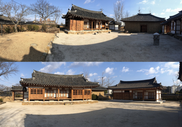 경남 함안군 군북면 '태극기마을'에 있는 효성그룹 조홍제 회장의 생가. 위 사진은 안채(가운데)와 광채(오른쪽), 별채 터. 아래 사진은 겹집 구조의 사랑채(왼쪽)와 새로 복원한 별채. 이대진 기자