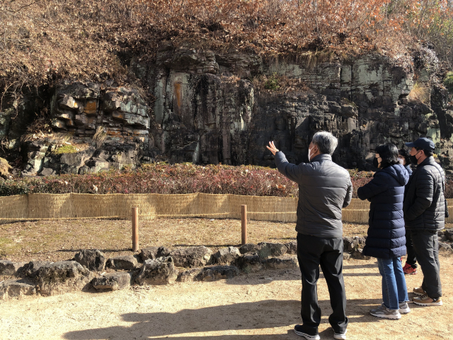 호암 생가의 부자기바위에서 발견할 수 있는 여러가지 형상에 대해 설명을 듣고 있는 방문객들. 이대진 기자