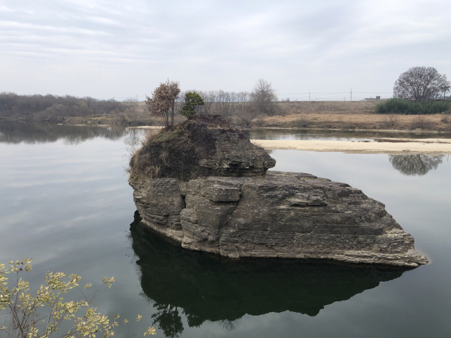 남강 한가운데 우뚝 솟은 솥바위. 수면 아래에 다리 달린 솥처럼, 발 3개가 바위를 떠받치는 구조여서 '부자 3명이 태어난다'는 전설이 생겼다. 이대진 기자