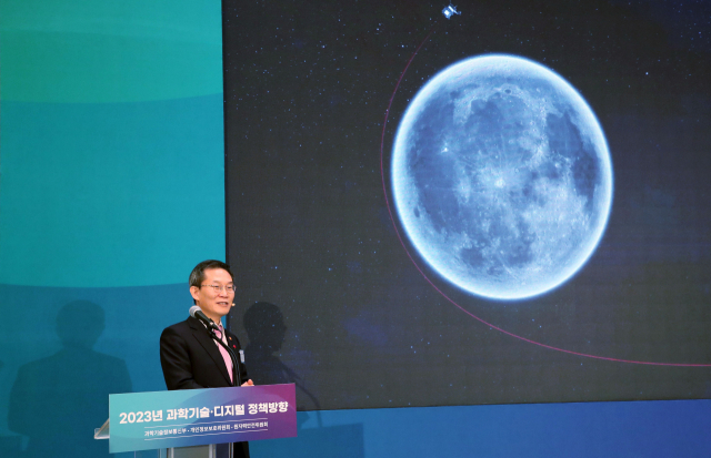 이종호 과학기술정보통신부 장관이 28일 청와대 영빈관에서 열린 ‘2023년 과학기술정보통신부·개인정보보호위원회·원자력안전위원회 업무보고’에서 윤석열 대통령에게 다누리호 달 궤도 진입 성공 사실을 밝히고 있다. 대통령실통신사진기자단 제공