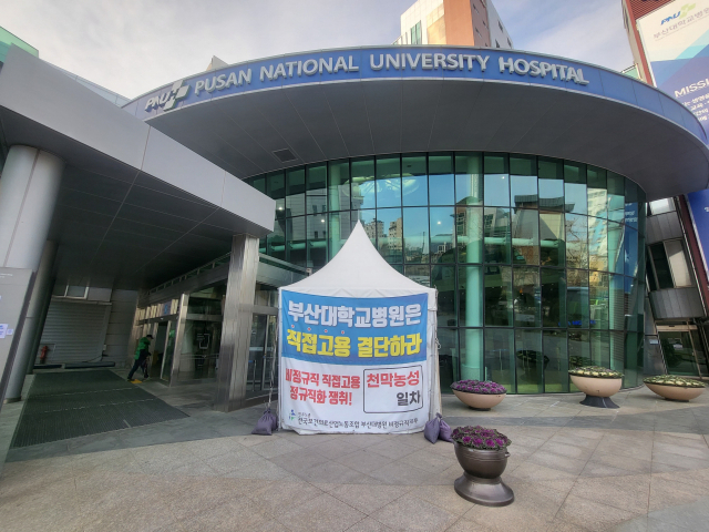 전국 13개 국립대학 중 정규직 전환이 완료되지 않은 곳은 부산대학병원이 유일하다. 사진은 전국보건의산업노동조 부산대병 비정규직지부가 부산대병원 앞에서 천막 농성을 하는 모습. 김준현 기자 joon@.