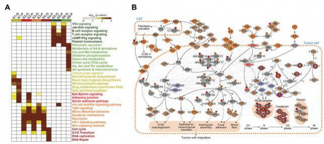 췌장암 6개 유전체분석 결과 유형에 대한 각각의 신호전달경로 분석 : 그림. 분류된 6가지 아형의 주요 신호전달경로. A)여섯 종류의 아형의 대표적인 신호전달경로 분석. 이는 췌장암의 분자 수준의 특징을 정의하는데 핵심적인 정보를 제공한다. B)치료반응이 나쁜 췌장암환자들인 아형 2-4에 대표적인 높은 전이성 (invasive)과 가장 나쁜 예후를 보이는 아형 4의 세포 증식 특성을 보이는 신호전달경로를 확인함. 고려대 제공