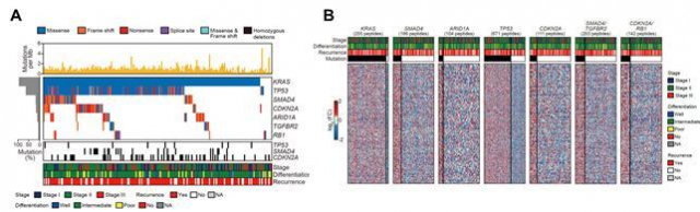 그림. 유전체 분석을 통한 유의미한 변이 유전자 (SMG) 동정: A)췌장암 환자에서 찾아진 유의미한 변이 유전자인 KRAS, TP53, CDKN2A, SMAD4, ARID1A, TGFBR2, RB1를 확인한 그림. B)7개의 유의미한 변이 유전자 모두 단백질 인산화 정도와 높은 상관관계를 보임. 고려대 제공
