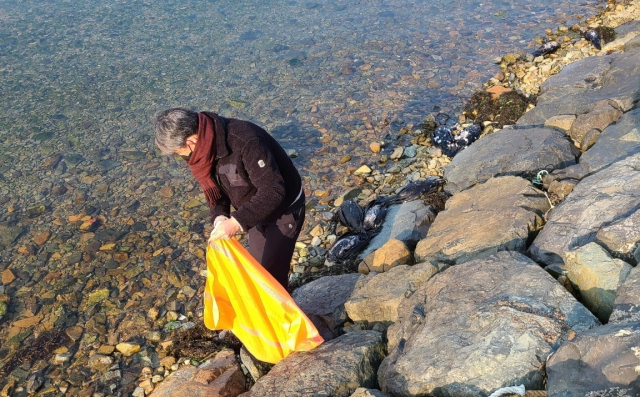행인의 신고를 받고 현장을 찾은 거제시 환경과 직원들이 가마우지 사체를 수거하고 있다. 거제시 제공