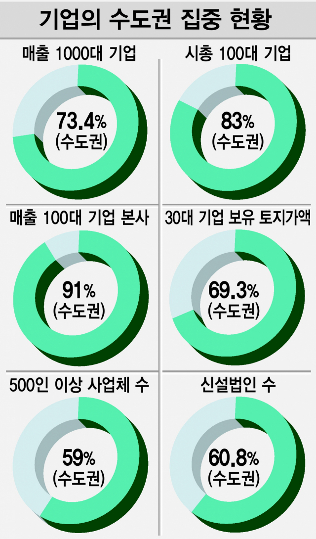 부산연구원에 따르면 매출 100대 기업 중 91%가 본사를 수도권에 두고 있고, 시총 100대 기업 중 83%가 수도권에 있다. 매출 1000대 기업으로 기준을 넓혀도 전체의 73.4%가 수도권에 있다. 기업체의 수도권 집중 가속화로 일자리와 인력이 수도권으로 이동하는 양상이 고착한 것이다.