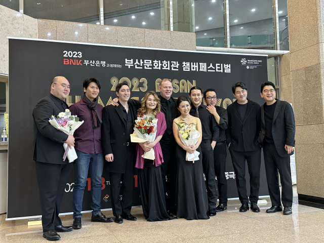 3일 부산문화회관 중극장에서 열린 '부산문화회관 챔버 페스티벌' 개막 연주회가 끝난 후 기념 사진을 찍고 있는 연주자들. 김은영 선임기자 key66@