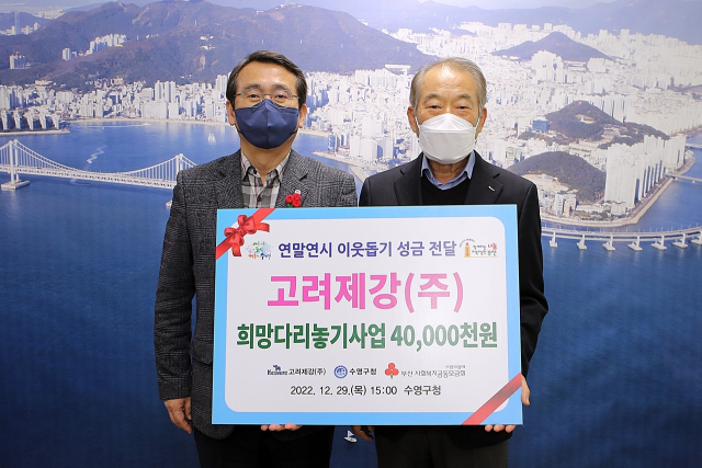 고려제강(주)(부회장 이이문)은 지난 29일 생활이 어려운 주민에게 전달할 ‘수영구 희망다리놓기 사업’ 성금 4000만 원을 부산 수영구청(구청장 강성태)에 기탁했다.